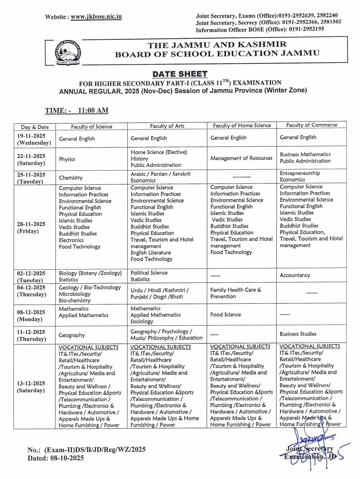 The Jammu and Kashmir Board of School Education – JKBOSE has officially published notification PDF for Class 11th Date Sheet 2025 for the Annual Regular – Winter Zone session of Jammu Province. As per notification published as Exam-II/DS/B/JD/Reg/WZ/2025 on 08 of October 2025 the exams will begin from 19 of November 2025 and continue until 13 of December 2025. This date sheet covers all streams of Science, Arts, Home Science and Commerce and with all examinations timing at 11:00 AM across all centers in Jammu’s Winter Zone region. Those Students appearing for the Annual Regular exams can now download and follow the complete timetable to begin their final preparation form official website.