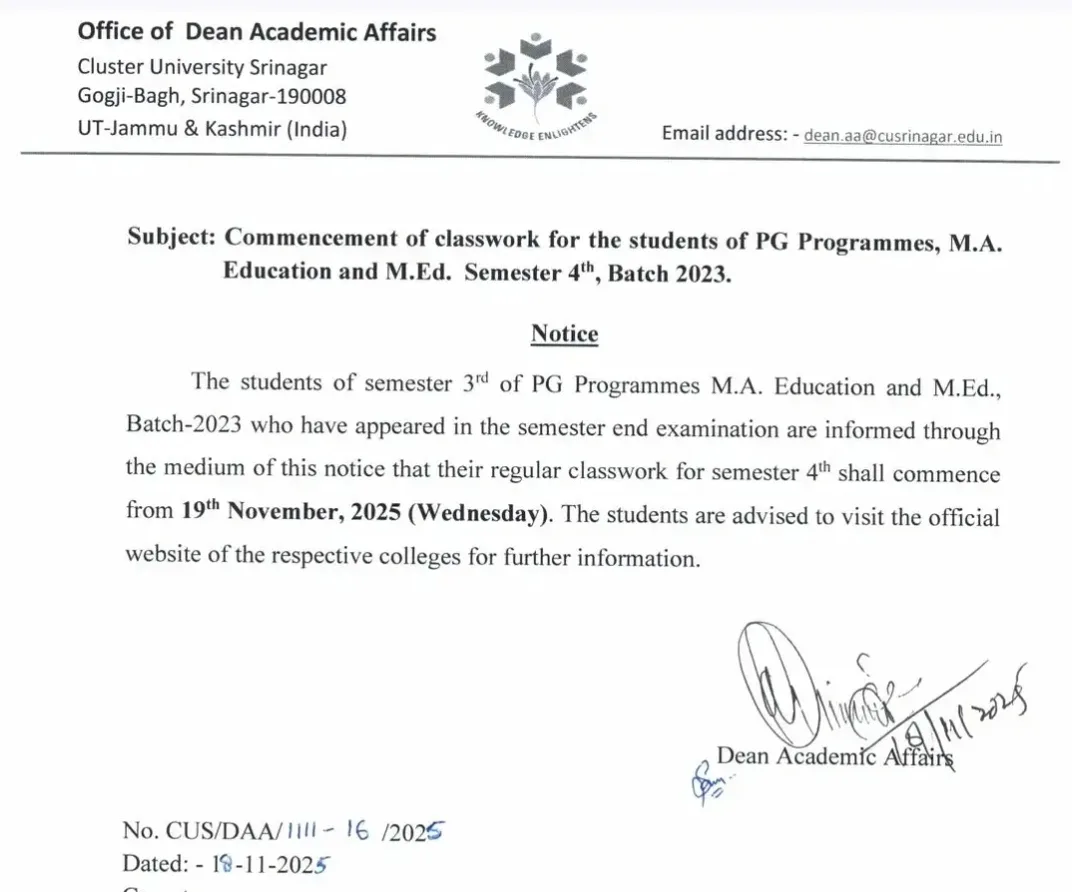 The Cluster University Srinagar – CUS has officially published notification PDF for start of regular classwork for MA Education and M.Ed 4th Semester students of Batch 2023. According to the notification released by the Office of Dean Academic Affairs all students who have appeared in their Semester 3 examinations will start their Semester 4 academic activities from 19 of November 2025 that is Wednesday. This important update brings clarity for postgraduate students under the School of Education and is helping them plan their academic schedule for the next semester. The university has urged students to visit their respective college websites for more detailed academic updates, including timetables, course distribution and departmental instructions. In this article we will see about essential information about the MA Education M.Ed 4th Semester Classwork 2025 including important dates, eligibility, academic instructions and what students should expect from the upcoming semester. Let’s go into details:
